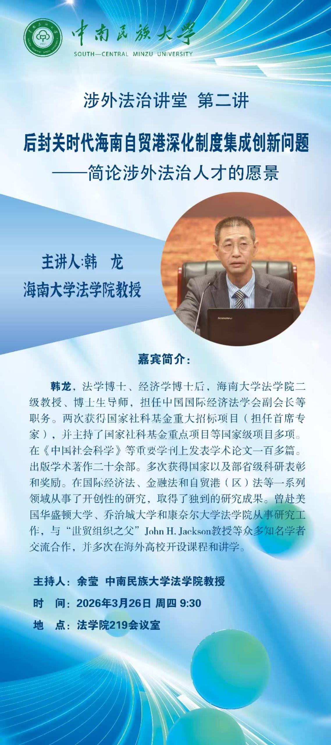 【学术预告】涉外法治讲堂:后封关时代海南自贸港深化制度集成创新问题——简论涉外法治人才的愿景