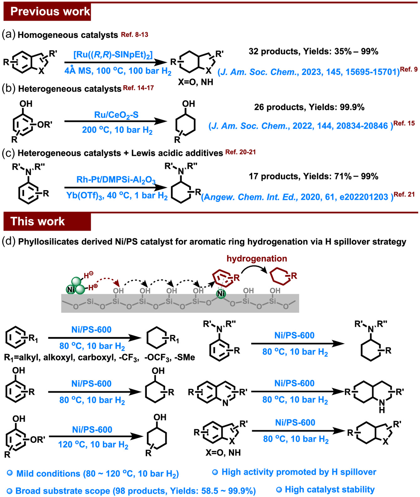 氢溢流是多相催化加氢中的一种独特效应,通过活性氢从金属向载体迁移,可有效降低加氢反应的活化能垒,从而提高催化加氢反应效率。该研究通过层状硅酸盐还原热解制得Ni纳米颗粒均匀分散的Ni/SiO2催化剂,该催化剂金属Ni掺入载体SiO2基质中,使得载体表面存在丰富的配位不饱和Ni2+位点(Lewis酸位点)和Si-OH基团(Brønsted酸位点)。前者通过吸附不饱和底物分子为氢迁移提供势能;后者为氢迁移提供介质,二者与Ni纳米颗粒协同促进非还原性SiO2载体与Ni纳米颗粒间的氢溢流,实现温和条件下(80-120 °C,H2 10 bar)高效加氢还原烷基苯、(N-取代)苯胺、苯酚和烷氧基取代苯酚等>98种(杂)芳环。