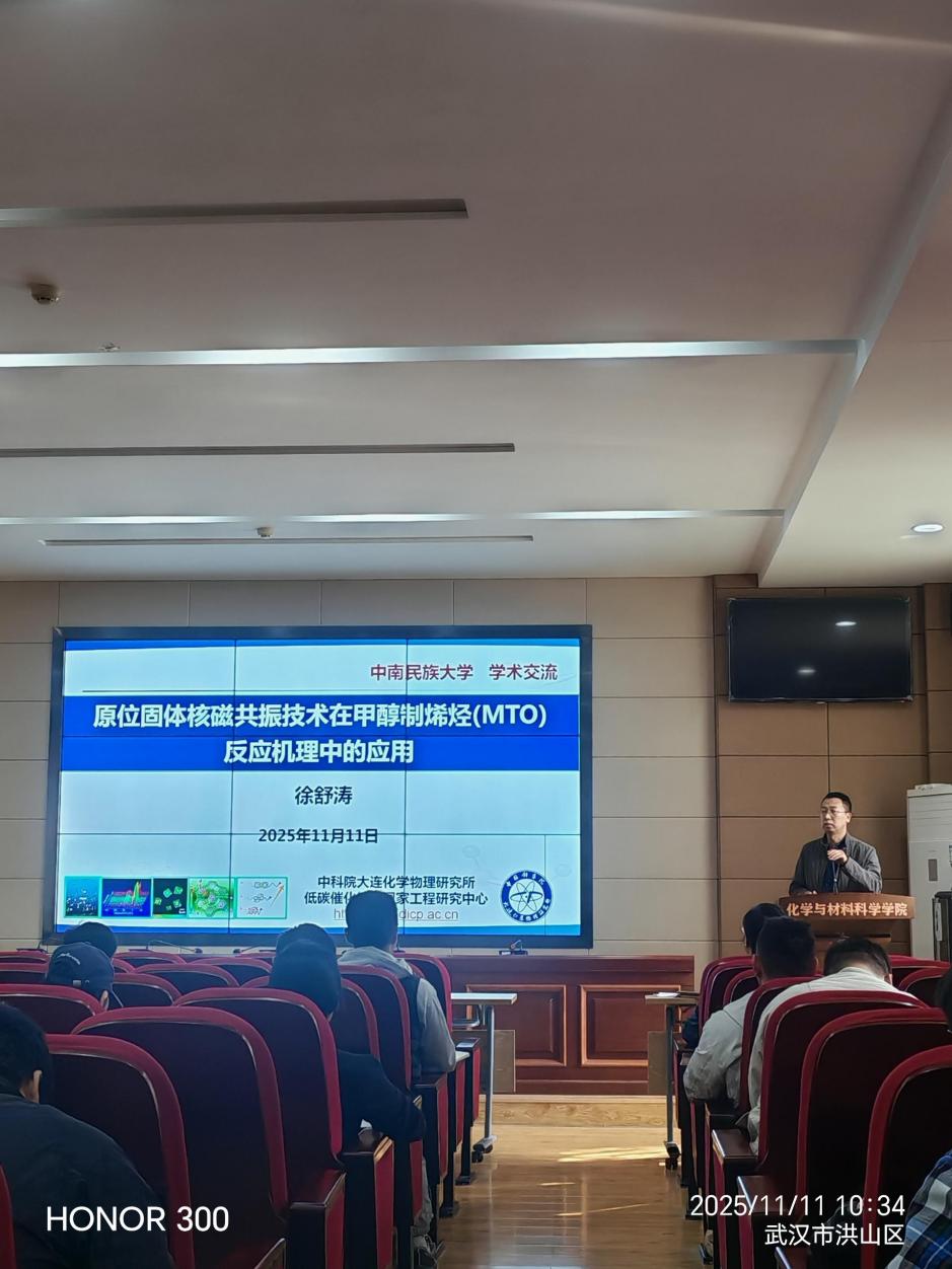 2025年11月11日上午,中国科学院大连化学物理研究所徐舒涛研究员应邀莅临化学与材料科学学院作题为《原位固体核磁共振技术在甲醇制烯烃 (MTO) 反应机理中的应用》学术讲座。本次报告由化学与材料科学学院副院长王立教授主持,学院相关教师及研究生参加。