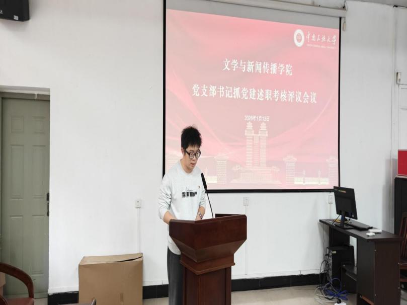 (通讯员朱民辉 摄影曾令建)2026年1月13日下午,学院召开2025年度基层党支部书记抓党建述职评议会。学校党建述职评议督导组成员唐光海、张荔芳,文学与新闻传播学院“两委”委员,学院各基层党支部书记,师生党员代表参加会议。会议由学院党委书记钱文彬主持。