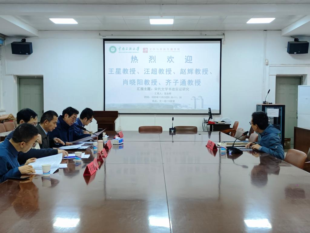 本站讯(通讯员:刘申 摄影:刘申)11月23日上午,2025年国家社会科学基金立项项目开题报告会(中国文学)暨2026年国社科选题申报论证会在文一楼119会议室举行,项目负责人党永辉老师就《宋代文学书迹实证研究》进行开题报告,王星教授、汪超教授、赵辉教授、肖晓阳教授、齐子通教授作为专家组成员受邀参会。