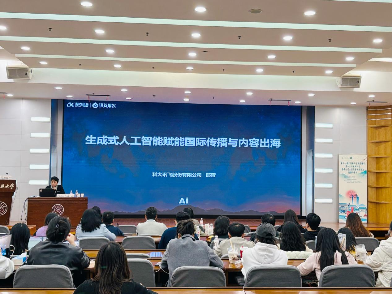 本站讯(通讯员:李妍 摄影:张从革)10月25日下午,学院举办第七届全国高等院校信息传播师资班,科大讯飞传媒行业垂直大模型负责人、综合解决方案总架构师、讯飞译制平台负责、科大讯飞智慧传媒业务部总监邵青受邀做题为“生成式人工智能赋能国际传播与内容出海”的学术讲座。讲座在学术交流中心国际厅举行,由我院田园子副教授主持,师资班全体学员、学院部分教师、全体新闻传播学研究生及部分本科生参加。