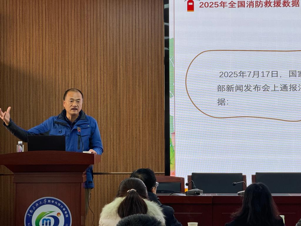 为持续筑牢校园安全防线,切实增强教职工消防安全意识与应急处置能力,12月18日下午,数学与统计学学院在9号楼309会议室举行消防安全专题培训。学院党委书记郭晖主持会议,学校保卫处副处长朱溢应邀担任主讲,全体教职工参加培训并参与消防演练。