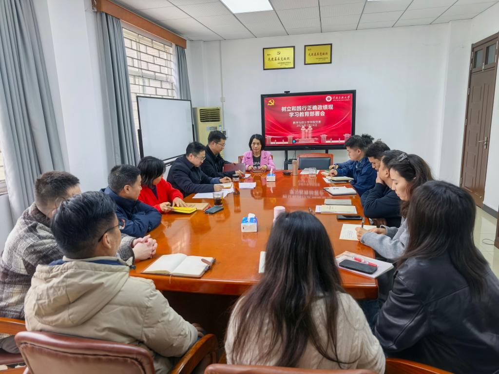 会上,郭晖领学了《习近平关于树立和践行正确政绩观论述摘编》等核心内容,传达了学校党委关于开展树立和践行正确政绩观学习教育部署会精神,组织学习了《数学与统计学学院关于开展树立和践行正确政绩观学习教育实施方案》。参会人员围绕“政绩为谁而树、树什么样的政绩、靠什么树政绩”这一根本问题,结合2026年学校中心工作和学院重点工作开展交流研讨。学院党委为各党支部和各系配发了《习近平关于树立和践行正确政绩观论述摘编》等学习材料。