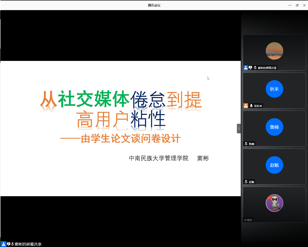窦彬教授从社交网站、微博、微信、博客、论坛、播客等社交媒体倦怠到提高用户粘性入手,为学生们就调查问卷设计进行了详细讲解。她从学术写作缘起、立意----问卷设计前的准备工作、文献研究----问卷设计第一步、建模----问卷设计的灵魂、统计方法----问卷数据分析的基础、题项的推敲----问卷成功的保障五个方面逐步进行分析,并结合实例为学生进行了细细剖析,引导学生进行研究设计。最后并与线上学生就当前的相关热点问题进行更广泛的交流。