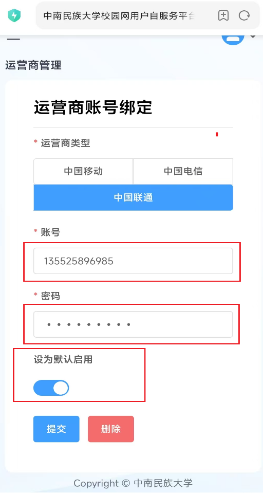 进入WebVPN系统后,在“业务系统”菜单中查找校园网用户自服务平台(如图3所示),点击进入校园网用户自服务平台(https://selfservice.scuec.edu.cn),选择相关运营商,并填入所分配的光网账号,并将“设为默认启动”按钮开启,点击“提交”按钮完成上网类型绑定(如图4所示,以“中国联通”为例)。