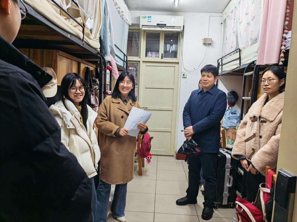 走访期间,老师们与同学们深入交流,详细询问返校旅途是否顺畅,细致了解大家返校后的精神状态、饮食作息等情况,耐心倾听同学们的寒假见闻与新学期规划。同学们积极分享假期所得:有的投身社会实践、志愿服务及学科竞赛,在实践历练中提升能力;有的专注学业备考,全力备战四六级、教师资格证考试,或提前开展考研英语复习;有的坚持每日阅读、撰写网评文,或参与学术交流活动,拓宽学术视野、提升科研素养。
