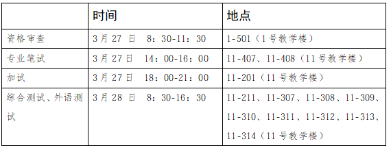 表1:资格审查、笔试(加试)、综合测试、外语测试时间及地点