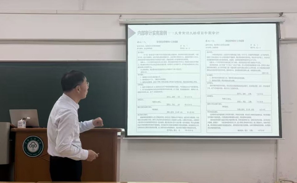 戴部长长期深耕建筑财税与内部审计领域,兼具丰富的企业管理经验和扎实的专业研究积累。讲座中,他立足企业内部审计工作的实际需求,围绕内部审计的理论基础、技术方法、作业流程和典型案例展开讲解,系统梳理了内部审计在规范管理、防范风险、提升治理效能中的重要作用,引导同学们从更广阔的实践视角认识审计、理解审计。