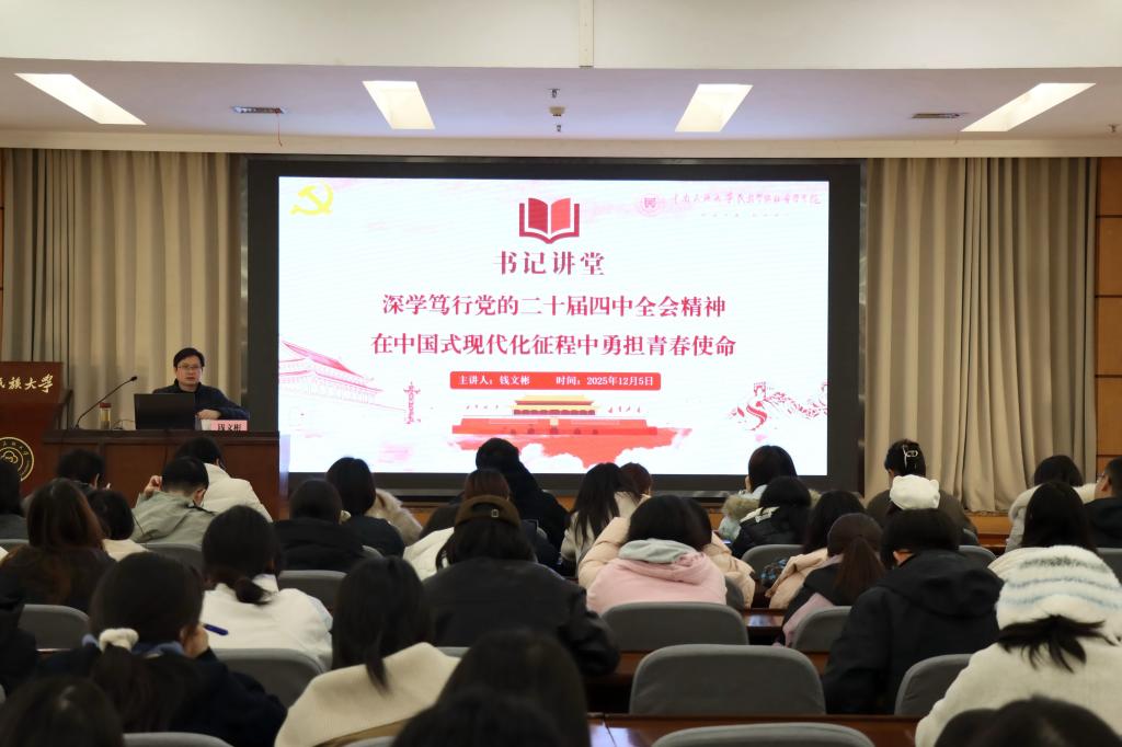 12月5日,我院深入学习贯彻党的二十届四中全会精神专题团课暨“书记讲堂”在学术交流中心润良报告厅举行。特邀学院党委书记钱文彬作专题培训。我院第二十二届团委学生会成员、第十二届基层团校学员以及各年级青年学生干部参加学习。