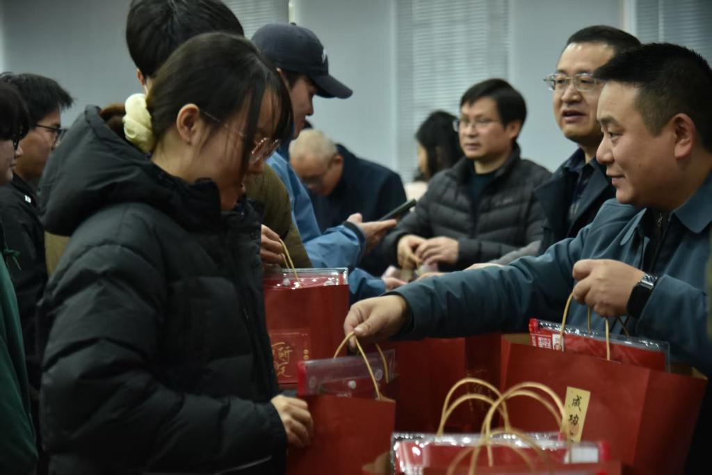 随后的慰问环节温情满满,领导与老师们向到场的每位同学发放了精心准备的慰问礼包。礼包中含有各院系老师们亲笔写下的祝福明信片,配置齐全的文具套装,预防流感的口罩,保暖驱寒的暖宝宝以及含有心想事成、一帆风顺等美好寓意的橙子、豆奶。礼轻情意重,一份份满载着深情的礼物,从实用角度出发,全方位契合了考研学子的当下实际需求,一方面传递了学院对同学们考研之路的坚定支持与美好祝愿,另一方面则寄托了学院对学子们深切的关爱与美好的祝愿,更是激励了同学们在冲刺阶段坚定目标,增强信心、勇往直前!