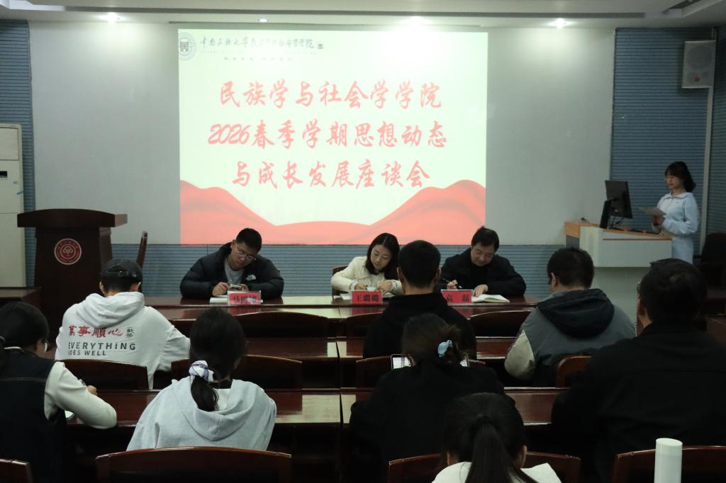 3月10日下午,我院在人类学实验室召开2026年春季学期边疆学生专题交流座谈会。学院党委副书记、学工办主任王璐璐,学工办副主任、2024级辅导员袁磊,团委副书记、2022级辅导员马博博出席会议,本硕博各年级学生代表及边疆地区学生代表参加座谈。
