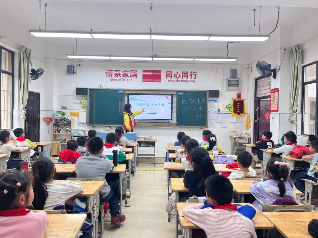 志愿者以“道中华”内容为依托,通过故事讲述与互动体验相结合的方式,向二年级学生阐释清明节背后的民族文化交融与民族团结内涵。从节气与节日的双重属性切入,串联介子推典故、唐宋节俗融合、元明清传承的历史脉络,展现寒食祭扫与上巳游乐如何汇成多元节俗;对照西南少数民族“三月三”与清明相通的祭祖竞技习俗,揭示各民族文化的互鉴共生;最终以非遗传承、共祭人文始祖、同缅革命英烈为落脚点,引导小学生理解慎终追远、家国相依的精神内核,感知中华民族多元一体的文化底色,铸牢中华民族共同体意识。