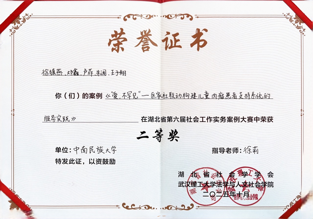 在本次大赛中,我院社会工作专业研究生徐镇燕、邓鑫、朱阁、卢菲、王子翔五位同学组成的团队,在徐莉教授的指导下,凭借案例《“爱,不罕见”——医家社联动构建肉瘤患儿支持系统的服务实践》荣获二等奖。该案例聚焦于罕见病患儿群体,以肉瘤患儿为服务对象,深入探索了医疗机构、家庭与社会工作三方协同联动的专业服务模式。该案例是团队成员在武汉协和医院实习过程中完成的实务成果,展现了社会工作在健康关怀领域的专业价值。