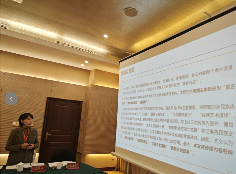 同一分论坛,基地博士研究生吴俊成以《社交媒体民族内容传播对增强中华文化认同的影响机制研究》为题进行汇报。