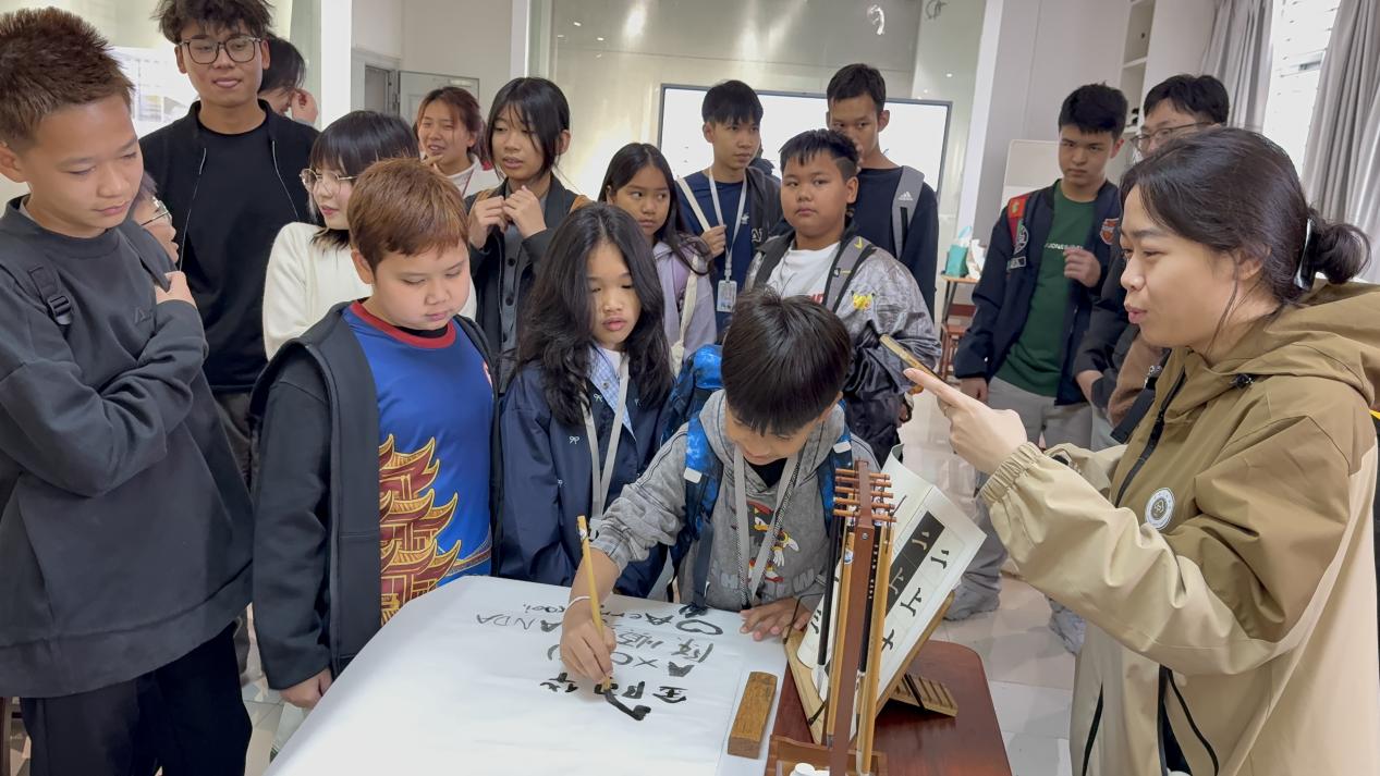 在示范中心,培训班师生先后参观了陶艺、动画、漆艺、模型等实验室。实验室先进的教学设施、精美的艺术作品和浓厚的文化氛围,让远道而来的泰国客人赞叹不已。大家不时驻足观赏、拍照留念,与在场的美院学子亲切交流。在国画临摹实验室,泰国小朋友们更是热情高涨,纷纷拿起毛笔,一笔一画认真书写自己的中文名字。在翰墨飘香中,孩子们真切触摸到汉字的独特魅力,沉浸式感受着中华文化的博大精深。