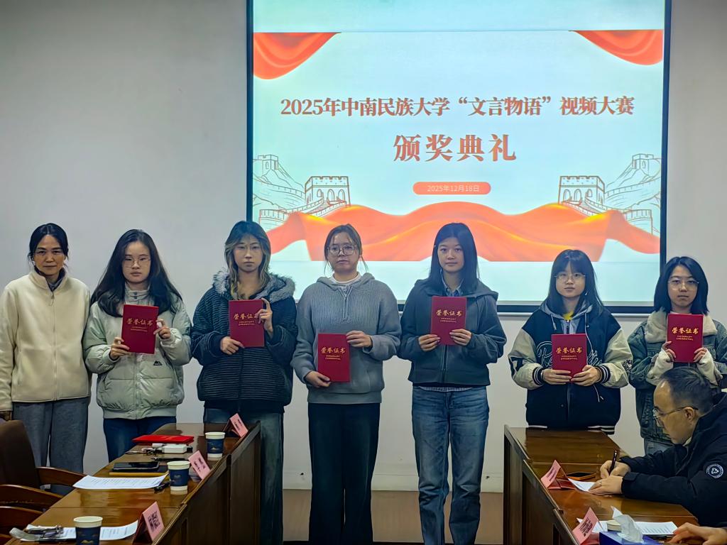 12月18日,由我馆联合党委宣传部(中华民族共同体建设工作处)、创新创业学院、校团委共同主办的首届“文言物语”视频大赛圆满落幕。本次大赛以“视频说中华”为主题,依托我馆馆藏文物资源,引导青年学子用镜头语言解码文物背后的中华民族共同体密码,涌现出一批兼具学术深度与传播活力的优秀作品。颁奖典礼在我馆多媒体教室举行,校领导、各主办单位负责人及获奖师生代表出席活动。