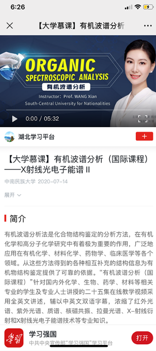 《有机波谱分析(国际课程)》共有25节,采用全英文讲授,辅以中英文字幕,并配以图片、动画和短视频。该课程内容涵盖了红外光谱、紫外光谱、质谱、核磁共振氢谱和碳谱、拉曼光谱、X-射线衍射、X-射线光电子能谱等主要的现代有机波谱分析技术,旨在引导学生了解关键科技信息并自主构建知识框架,观察科学现象和发现科学规律。其中,“质谱介绍”曾获得全国高校首届微课比赛决赛三等奖。线上课程设计还包括所有章节的英文PPT课件、习题、热点讨论等,有助于学生课前预习、课后复习,训练综合思考能力及逻辑思维。该课程已于7月3日上线“学习强国”湖北学习平台。