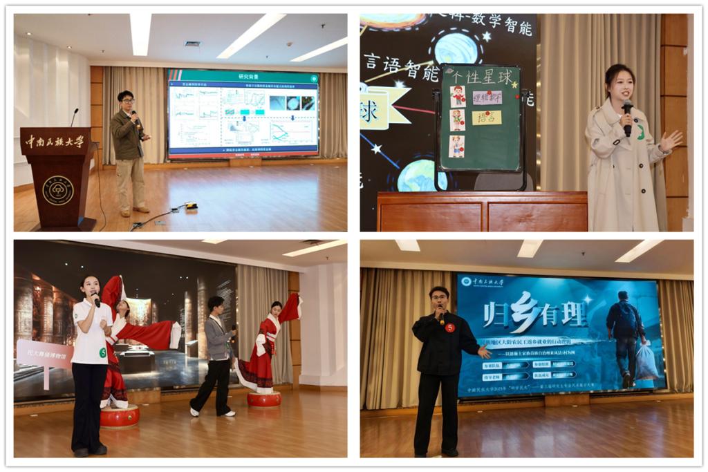 决赛现场气氛热烈,各团队围绕项目主题展开精彩陈述与多彩展示,呈现了一场跨界融合的学术盛宴。“精研所致”赛道中,化学与材料科学学院、电子信息工程学院团队深耕科技应用,民族学与社会学学院团队聚焦民族地区农民工返乡议题,彰显人文关怀。“科启新知”赛道项目则凸显学科融合与社会实践特色,马克思主义学院、音乐舞蹈学院、文学与新闻传播学院团队以多样形式演绎主题,充分展现人文社科的创新活力。