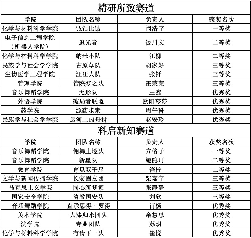 经评委综合评审,本次大赛评选出一等奖2项、二等奖4项、三等奖6项及优秀奖8项。化学与材料科学学院“铱钻比钻”团队、音乐舞蹈学院“俑舞止境队”分别斩获“精研所致”赛道和“科启新知”赛道一等奖。