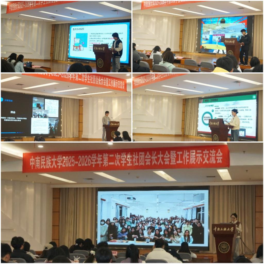 在社团工作展示交流环节,各社团代表紧扣“服务学校发展、彰显社团价值”主题依次进行工作汇报,分享活动经验与新学期规划。既有思想政治类社团在理论宣讲、铸牢中华民族共同体意识实践中的探索成果,也有志愿公益类社团在心理健康服务、支教助残、社会工作中传递的温暖力量;既有创新创业类社团在学科竞赛、创业实践、科创研发中积累的创新经验,也有学术科技类社团在专业研讨、科普推广、技能竞赛中彰显的学术活力,还有文化体育类社团在优秀传统文化传承、文体赛事举办、校园文化传播中的特色亮点……各社团结合自身特色,既展示了工作亮点与育人成效,也立足学校高质量发展大局,思考了社团的责任与担当,展现了民大社团人务实进取、勇毅前行的精神风貌。