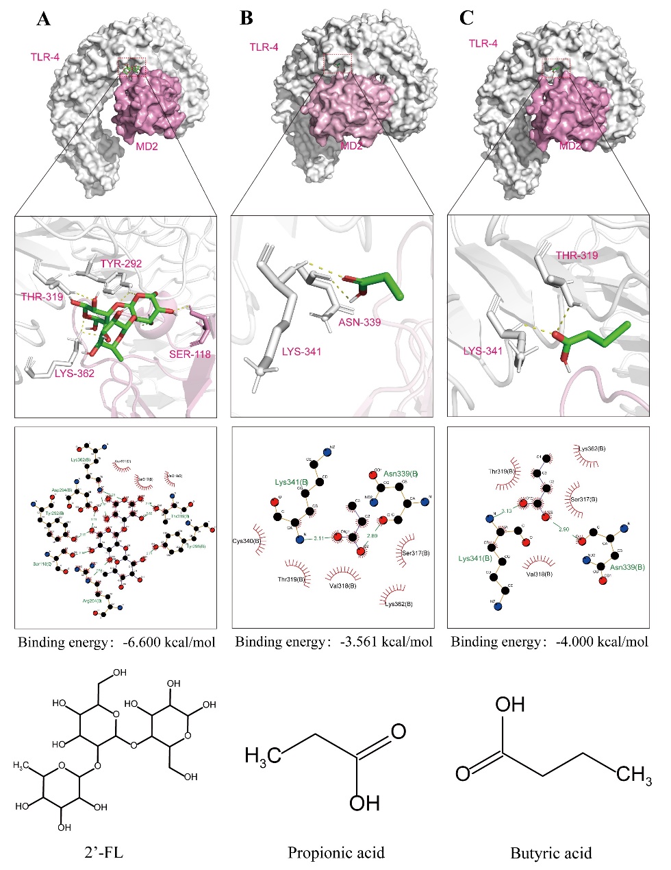 图2 2’-FL及其代谢产物丙酸、丁酸和TLR4-MD-2分子对接
