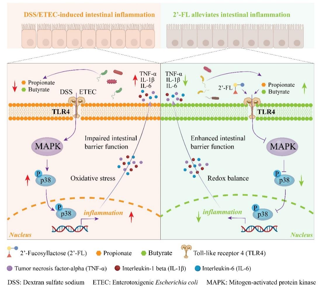 近日,我校生命科学学院郭小华教授团队在母乳寡糖(Human Milk Oligosaccharides, HMOs)精准营养研究领域取得阶段性进展。团队在国际上首次系统阐释了核心HMOs成分——2'-岩藻糖基乳糖(2'-FL)通过“直接受体调控”与“微生物代谢协同”的双路径互作机制,进而抑制肠道炎症的分子机理。这一发现为HMOs作为精准益生元干预肠道炎症性疾病提供了理论依据。相关研究成果以“2’-Fucosyllactose and its metabolites propionate/butyrate suppress inflammation through a shared TLR4/p38 MAPK-dependent pathway in vitro and in vivo”为题,发表在国际食品科学领域权威期刊《Current Research in Food Science》(中科院一区TOP期刊,IF=7.0)。论文链接:https://doi.org/10.1016/j.crfs.2026.101352。