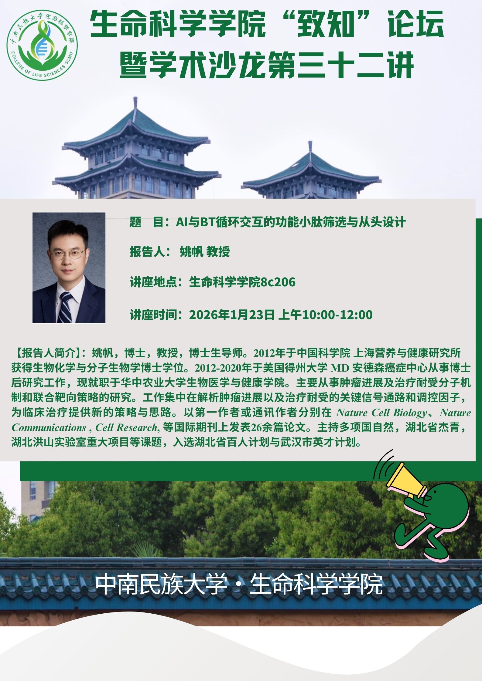 【生命科学学院“致知”论坛暨学术沙龙第三十二讲】华中农业大学姚帆教授:AI与BT循环交互的功能小肽筛选与从头设计