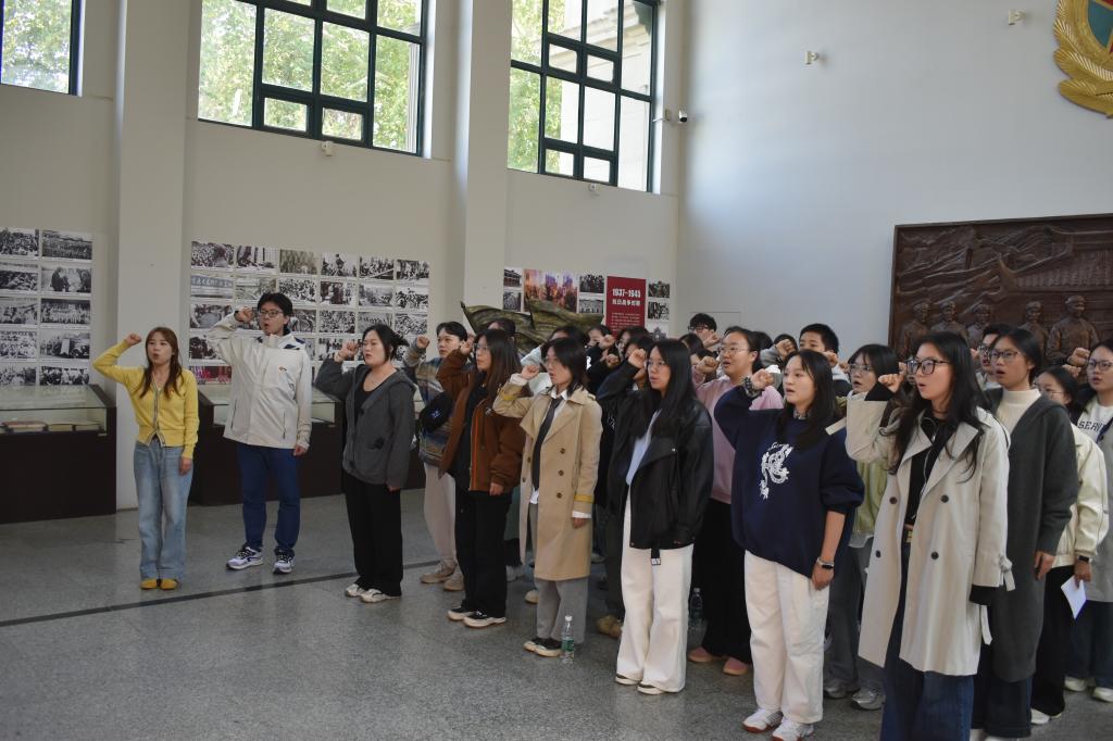 抵达石门峰纪念公园后,实践活动在庄重的“重温入党誓词”环节中拉开序幕。预备党员在湖北军民抗战博物馆一楼肃立,举起右拳庄严宣誓,“我志愿加入中国共产党,拥护党的纲领,遵守党的章程……”铿锵有力的誓言回荡在现场,不仅是预备党员对党的郑重承诺,更让在场全体学员接受了一次深刻的党性教育和精神洗礼。