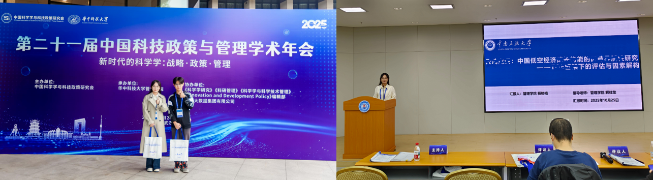 在此次学术年会分会场交流环节,我院2024级企业管理研究生杨格格就入选论文进行了专题汇报。汇报系统阐述了我国低空经济发展势能的时空动态演变特征,并基于TOE框架对影响区域发展差异的关键因素进行深入解构,为我国低空经济的区域协同与政策优化提供了实证依据与参考。现场汇报条理清晰、内容扎实,引发了在场学者的积极关注与讨论,展现了我院学子的良好学术素养与研究能力,体现了我院在科技创新管理与低空经济等新兴交叉领域的学术积累和人才培养成效。