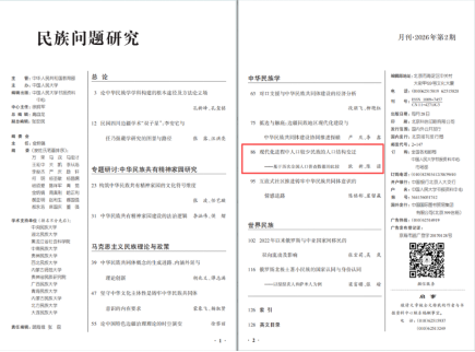 近期,我院耿新教授与中华民族共同体学院博士研究生陈诺在期刊《中南民族大学学报(人文社会科学版)》合作发表的学术论文《现代化进程中人口较少民族的人口结构变迁——基于历次全国人口普查数据的比较》被“人大复印报刊资料”《民族问题研究》2026年第2期全文转载。