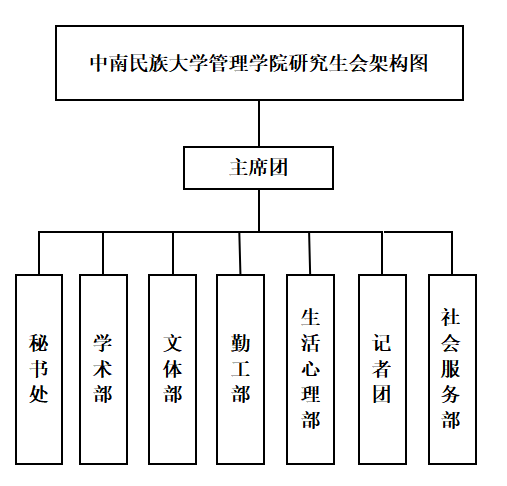 中南民族大学管理学院研究生会工作机构架构为“主席团+工作部门”模式,主席团下设:秘书处、学术部、文体部、勤工部、生活心理部、记者团和社会服务部共七个部门。