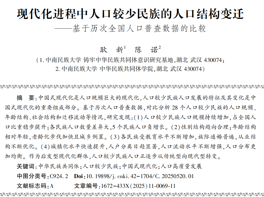 近期,我院耿新教授团队在人口较少民族现代化领域取得新研究进展,研究成果《现代化进程中人口较少民族的人口结构变迁——基于历次全国人口普查数据的比较》在我校期刊《中南民族大学学报(人文社会科学版)》上发表。耿新教授为论文第一作者,中华民族共同体学院的博士研究生陈诺为第二作者,我校为第一单位。