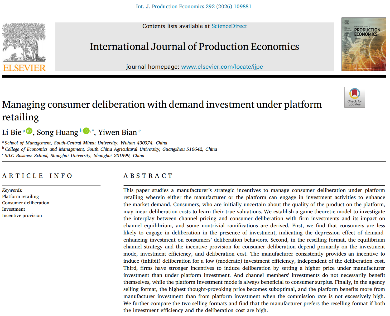 近日,管理学院别黎老师的最新研究成果《Managing consumer deliberation with demand investment under platform retailing》在国际权威期刊《International Journal of Production Economics》(JCR一区、中科院一区top,IF=10)的2026年第2期上发表,别黎老师为论文第一作者。该论文探讨了在平台零售环境下,当消费者对于新型科技产品的价值不确定而付出固定审议成本以明确自身实际估值时,供应链企业如何通过定价和需求扩大投资策略来战略性管理这种消费者审议行为,以及分析其对供应链绩效、消费者剩余和社会福利的影响,为理解零售平台中需求管理与投资决策提供理论与管理启示。