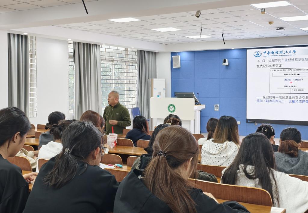 2026年4月9日,10-205教室充满厚重的学术气息,中南财经政法大学博导施先旺教授应管理学院财务管理专业邀请为2023级做“数字化转型背景下‘业财合一’会计改革研究”专题讲座。本次活动旨在紧跟财务数智化发展前沿,深化学生对会计改革与业财融合的理解,推动财务管理专业扎实开展破圈入流行动。