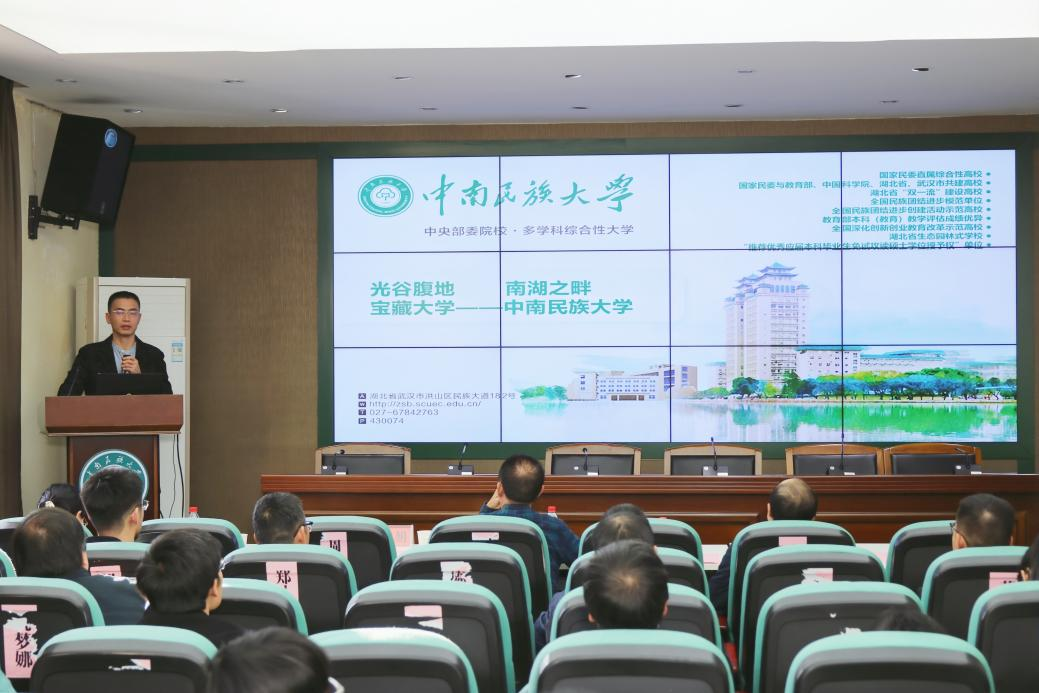 覃瑞代表学校致欢迎词,他介绍了中南民族大学的办学定位与发展特色。他指出,学校始终坚持聚焦铸牢中华民族共同体意识主线,落实立德树人根本任务,不断优化人才培养体系,推动教学改革与科研创新协同发展。他表示,期待双方以此次交流为契机,在招生宣传、人才培养和文化传承等方面深度合作,共同构建资源共享、优势互补的协同育人机制,共同培养更多高素质人才,为地方经济发展和民族团结事业做贡献。