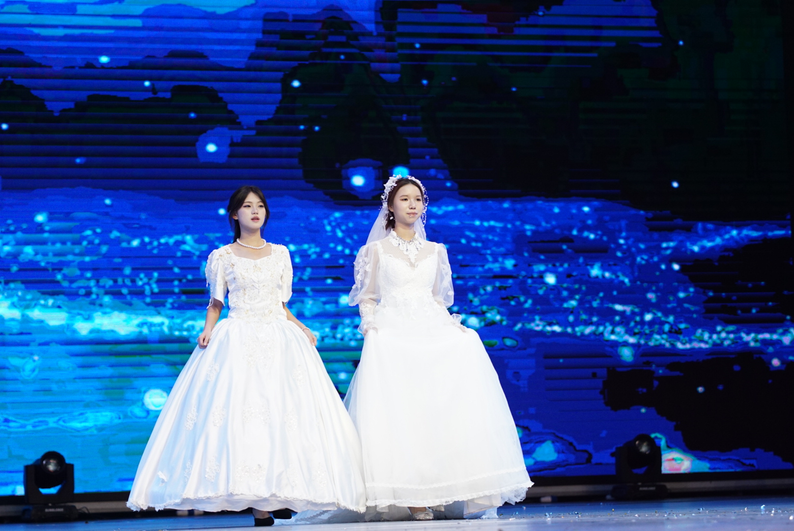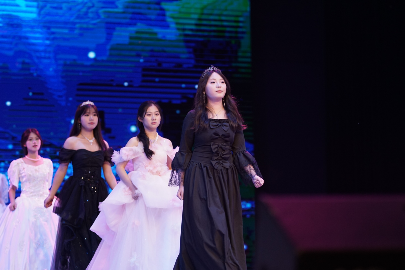 灯光聚焦,一道流动的青春风景线展开。礼仪组身着西装与礼服裙,步履从容,气韵优雅,展现属于时代的审美风貌与自信姿态,引发现场阵阵欢呼。