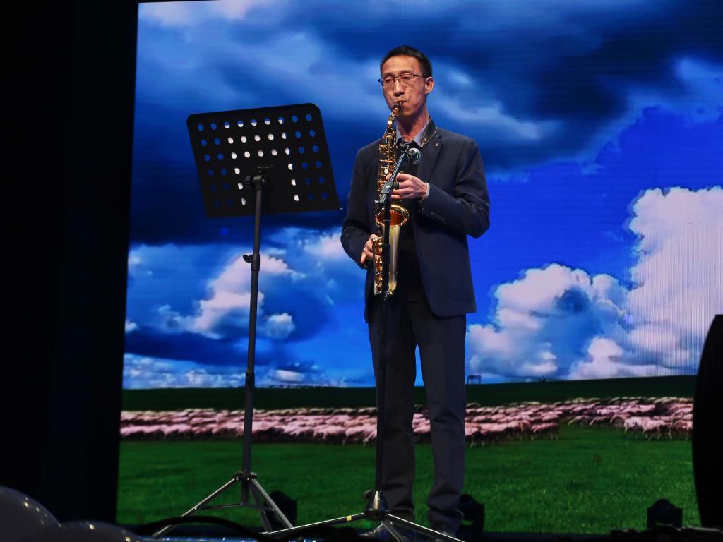 迎新晚会惊喜时刻!院党委书记桂孙来手持萨克斯惊艳登台,与两名同学联袂献上乐器合奏《梦中的额吉》。悠扬旋律交织温情,瞬间点燃全场,欢呼与掌声经久不息。
