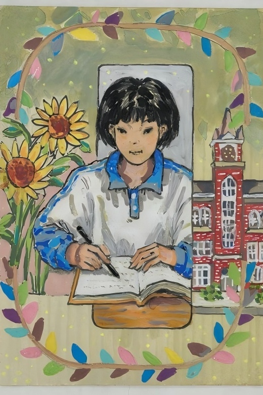 作品简介:通过梅花、向日葵与校园剪影等元素,象征坚韧、希望与成长,传递勤学善思、逐光而行的精神力量。