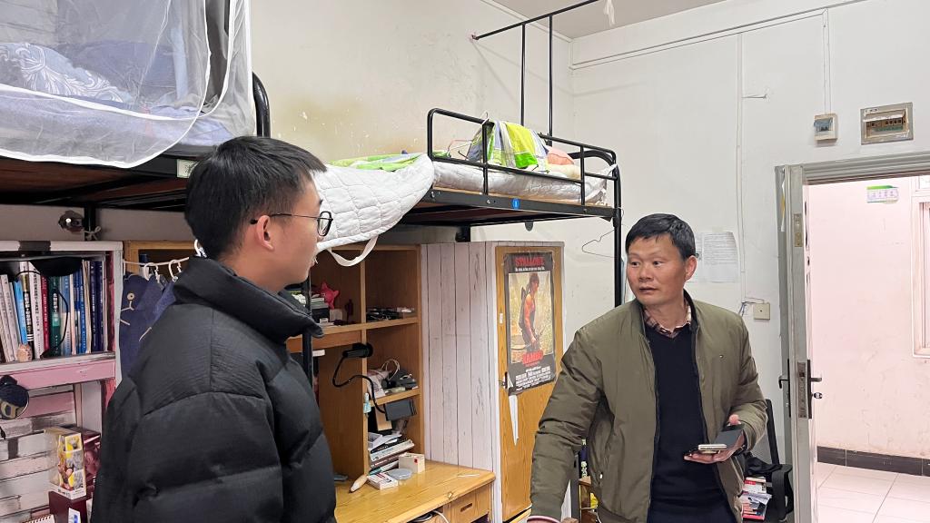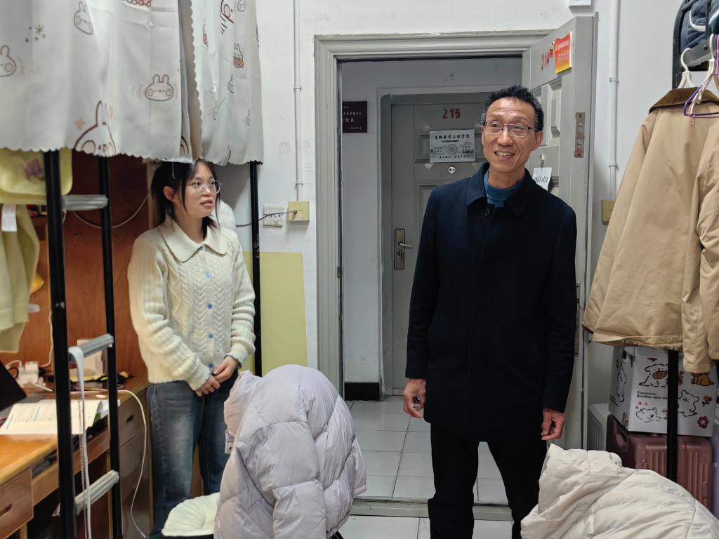 在大四和研究生宿舍,就业与升学成为核心话题。副院长李旭仔细询问每位同学的求职进展、考研复试状态,逐一了解大家在简历优化、面试技巧、院校选择等难题,现场给出指导性意见。副院长陆雪松与同学们探讨课题进展、实验瓶颈,分享学术论文写作经验,鼓励大家 “既要沉下心做研究,也要多参加学术会议,拓宽学术视野”。