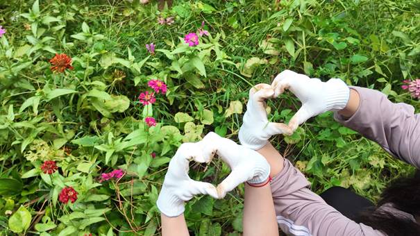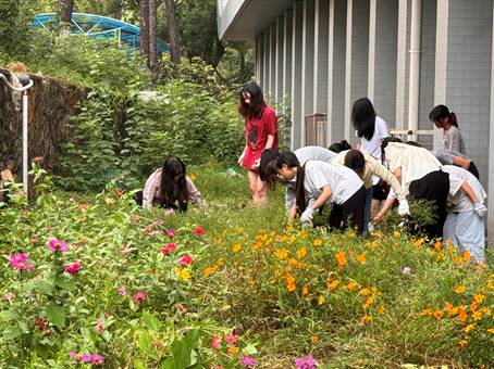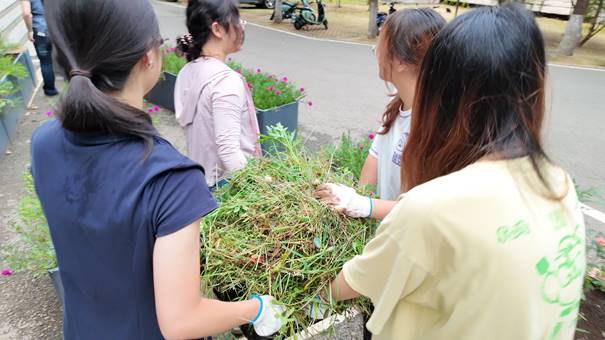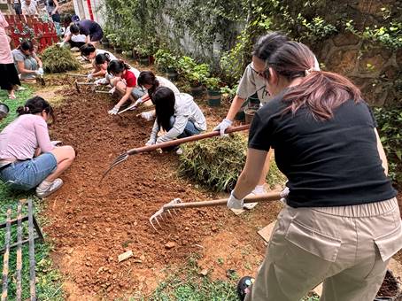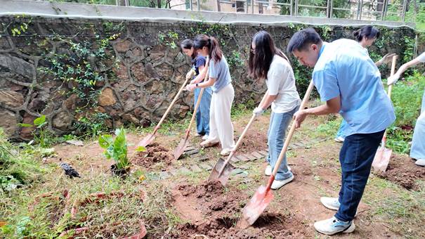 实践环节中,同学们热情投入,分工协作:有人专注除草,仔细清理每一株杂草;有人精心修剪,认真打量每根枝条;还有人栽种新苗,轻轻培土浇水,期待它们茁壮成长。经过辛勤劳作,原本杂乱的区域变得整洁有序,生机盎然。