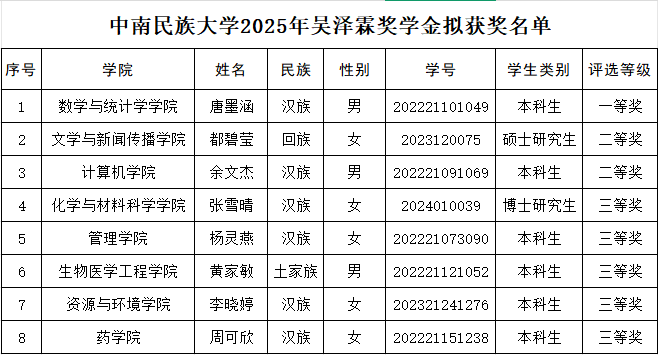 根据《中南民族大学学生奖学金评选办法(修订)》(民大发〔2025〕55号)文件精神,经过学生申请、学院初评、学工部(处)复核、学校审核,共评选出数学与统计学学院唐墨涵等8名同学拟获得2025年吴泽霖奖学金,其中一等奖1人,二等奖2人,三等奖5人。具体名单如下: