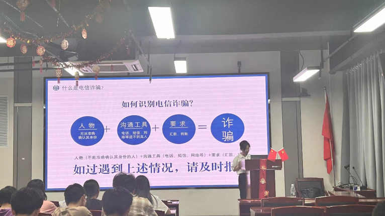 会上,各班主讲人围绕“防范电信网络诈骗”为主题,以PPT内容形式带领学生重温电信诈骗常见手段,学习了解近期相关案例,进一步强化学生防电诈意识和行为。