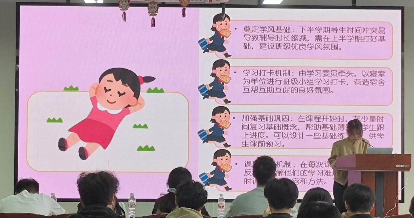此外,生医类2406班通过正向激励和日常监督,激发同学们的学习热情,助力同学们主动投入学习当中。生医类2403班不断优化线下辅导的方式方法,注重课程内容讲解的有趣性,显著提升辅导实效。其他导生团队也结合班级实际情况,对帮扶举措、班级成绩等内容进行了详细的汇报。