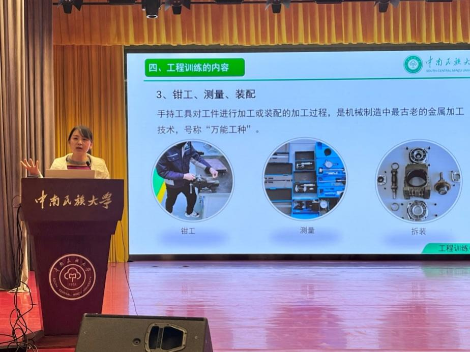 余竹玛围绕工程训练概论课,梳理实训课程安排,讲解车削加工、铣削加工等核心实训内容,并重点强调安全考试、着装准则、预习任务等安全规范,帮助学生熟悉实训要求、增强安全防范意识。