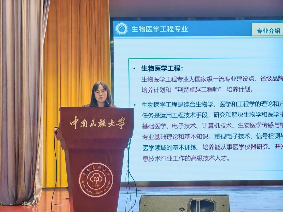 周慧老师对生物医学工程专业进行了全面宣讲。她围绕“医工融合,志惠民生”的核心定位,系统介绍了专业的交叉学科属性、完整课程体系与实践培养特色,明确了以培养兼具医学素养与工程技术能力的复合型人才为目标。同时,她结合近五年就业与升学数据,详细解读了毕业生在医疗卫生、医疗器械、电子信息等领域的发展路径,为同学们的专业选择提供了清晰指引。