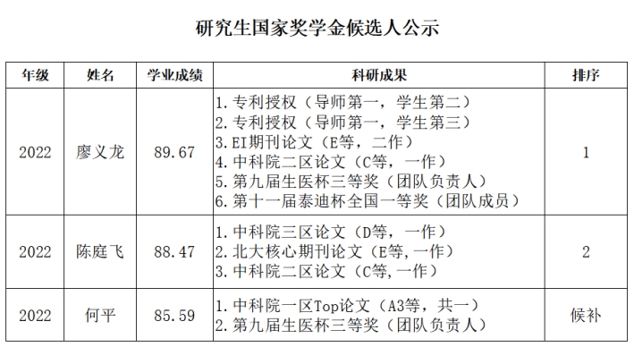 根据《中南民族大学研究生国家奖学金评审实施办法(修订)》(民大发〔2018〕21号)和《生物医学工程学院研究生国家奖学金评审实施细则》及相关文件精神,经研究生个人申报,学院研究生国家奖学金评审小组综合评议,并报学院党委会审议通过,确定2024年生物医学工程学院研究生国家奖学金候选人名单,现公示如下: