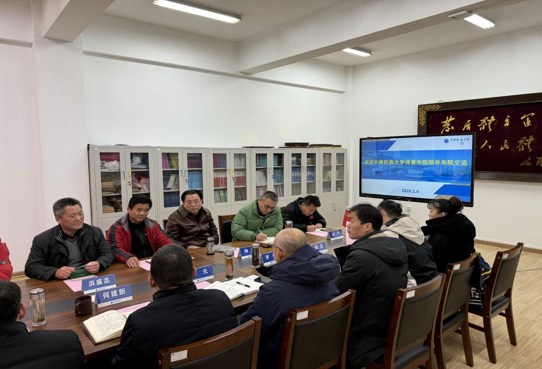 中国地质大学体育学院党委书记何建新对中南民族大学体育学院各位领导的来访表示欢迎。他指出,两个学院位置紧依相邻,各具发展特色,师生交流活跃。希望双方加强沟通交流,互学互鉴,共同发展。我院郝家春院长和中国地质大学体育学院李元院长分别介绍了各自学院发展情况。我院党委书记洪盛志表示,地大体院办学特色鲜明、学科定位准确、发展成果丰硕,方法值得借鉴。希望双方在特色发展、体育铸牢、党建工作等方面深化合作、优势互补。