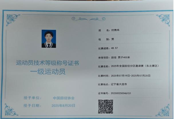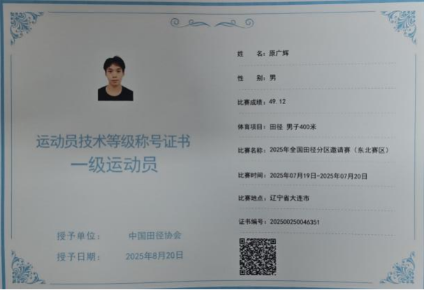 近日,我院社会体育指导与管理专业2024级付焘玮、2023级原广辉收到中国田径协会颁发的运动员技术等级称号证书,双双获得田径男子400米一级运动员。此次成绩的取得,标志着我院在人才培养上实现新的突破,这也是我院建院以来自主培养的首批田径项目国家一级运动员。