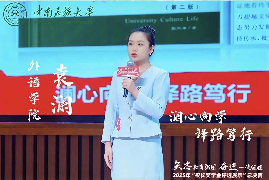 近日,我校2025年度校长奖学金总决赛圆满落幕。经过激烈角逐,外语学院翻译专业2022级本科生袁澜凭借优异的综合表现脱颖而出,成功荣获校长奖学金。此外,袁澜已保送至复旦大学继续攻读硕士研究生,展现了外语学院学子卓越的成长潜力和全面发展的优秀素养。